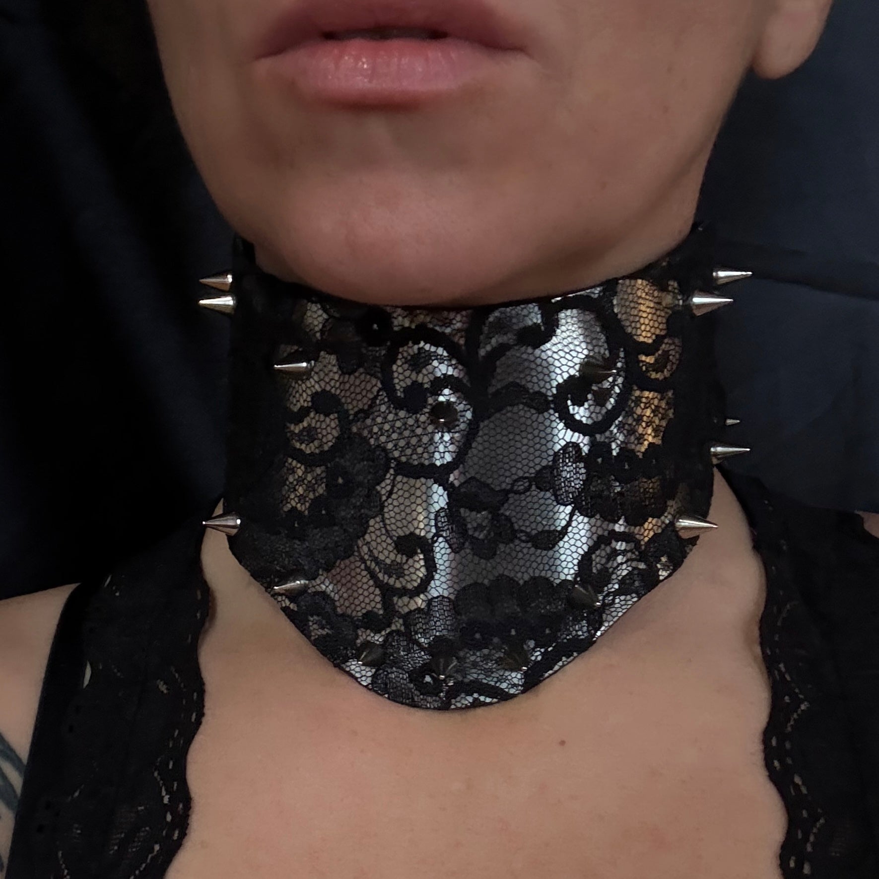 Lace Queen — Luxury Fetish Posture Collar in Stainless Steel, Lace & Spikes