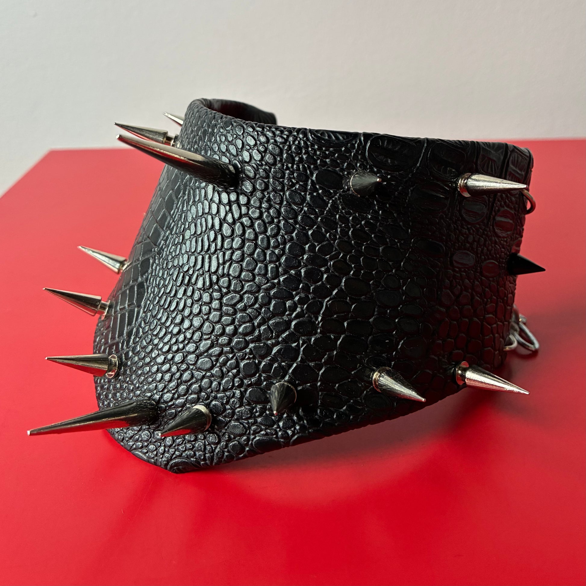 Structured faux crocodile leather collar with stainless steel spikes